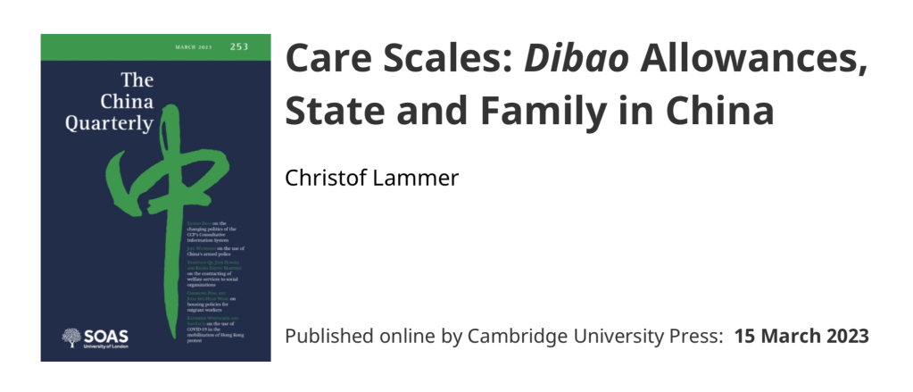 Lammer, Christof. 2023. „Care Scales: Dibao Allowances, State and Family in China.“ The China Quarterly: https://doi.org/10.1017/S0305741023000309. [Open Access]